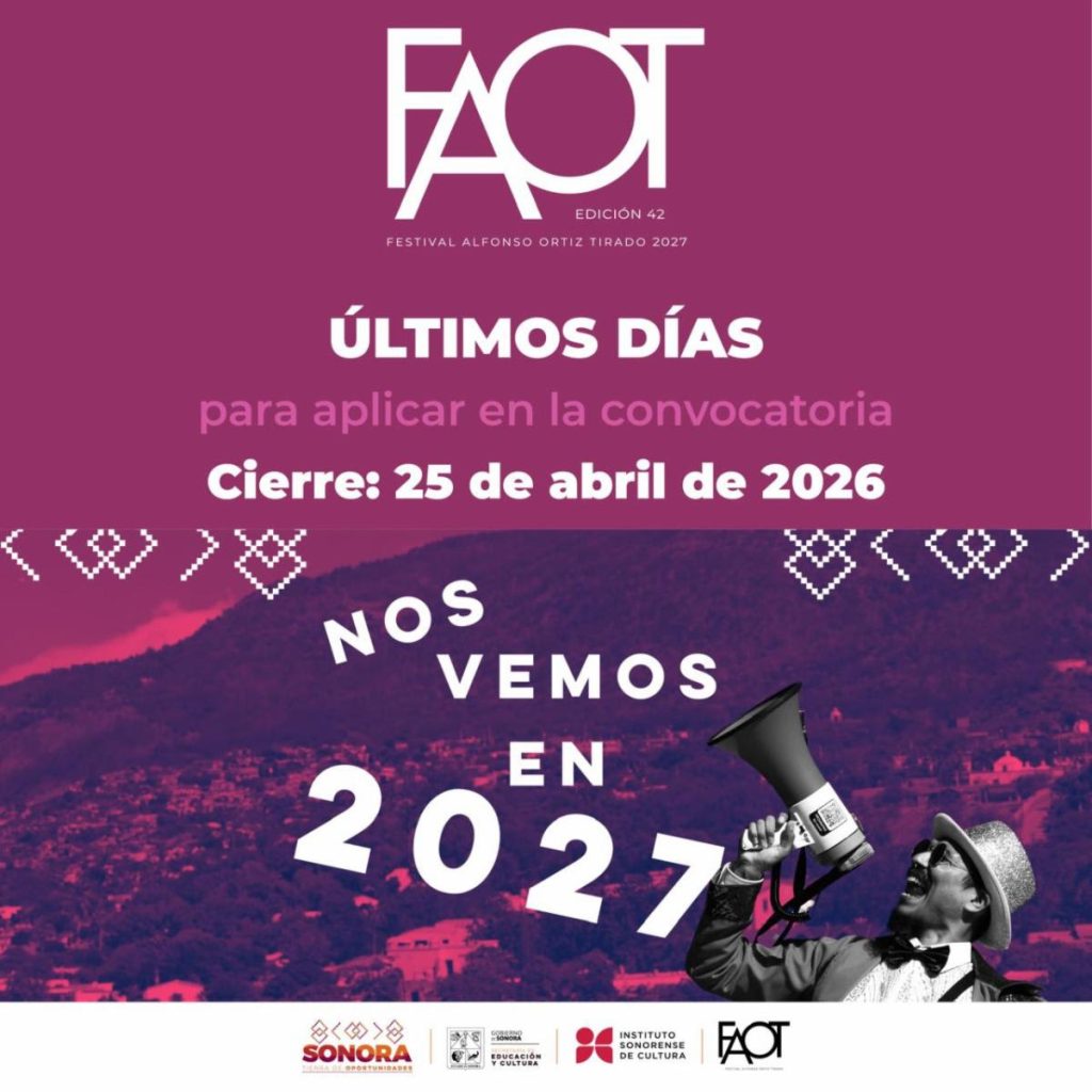 Hermosillo, Sonora; 20 de abril de 2026.- El Gobierno de Sonora, a través de la Secretaría de Educación y Cultura (SEC) y el Instituto Sonorense de Cultura (ISC), invita a creadores, artistas, instituciones educativas y promotores culturales de todo el mundo a registrarse en la convocatoria del 42 Festival Alfonso Ortiz Tirado (FAOT), que se llevará a cabo del 22 al 30 de enero de 2027 en Álamos, Sonora. El plazo para el registro cerrará el domingo 25 de abril de 2026 a las 23:59 horas.