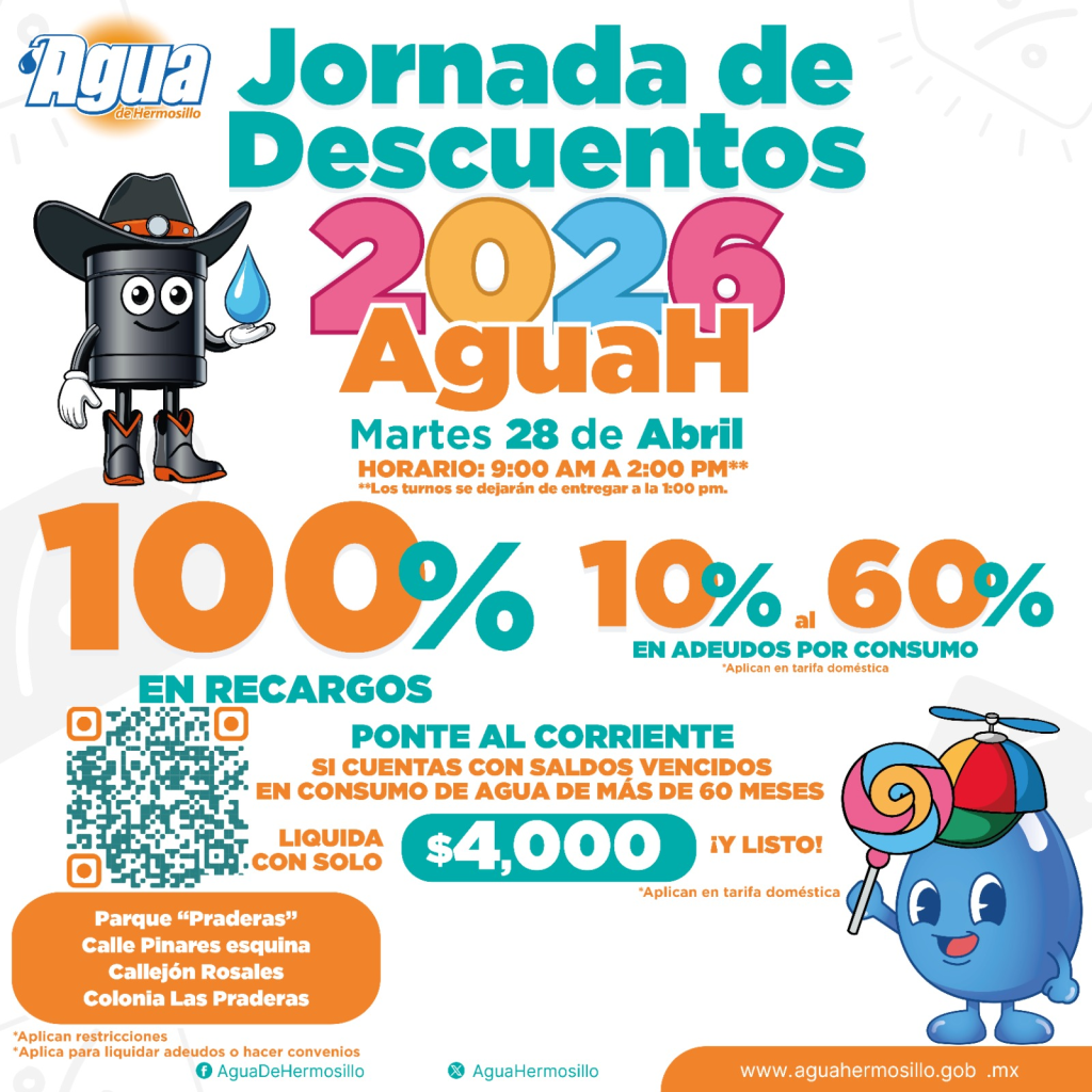 Hermosillo, Sonora; 25 de abril, 2026.- Personas con adeudos en el servicio de agua potable tendrán la oportunidad de regularizar su situación durante la Jornada de Descuentos 2026 de Agua de Hermosillo que se llevará a cabo el próximo martes 28 de abril en el parque “Praderas”, ubicado en la colonia Las Praderas.