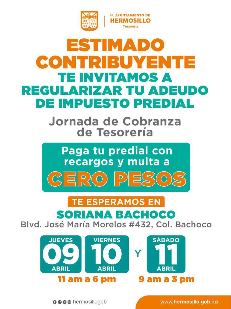 • Hermosillo, Sonora; 8 de abril, 2026.- Este jueves 9, viernes 10 y sábado 11 de abril llegará Tesorería Municipal con el Programa de Regularización de Predial a centro comercial Soriana Bachoco ubicado en bulevar José María Morelos número 432, con grandes beneficios en predial como cero pesos en recargos y multa.