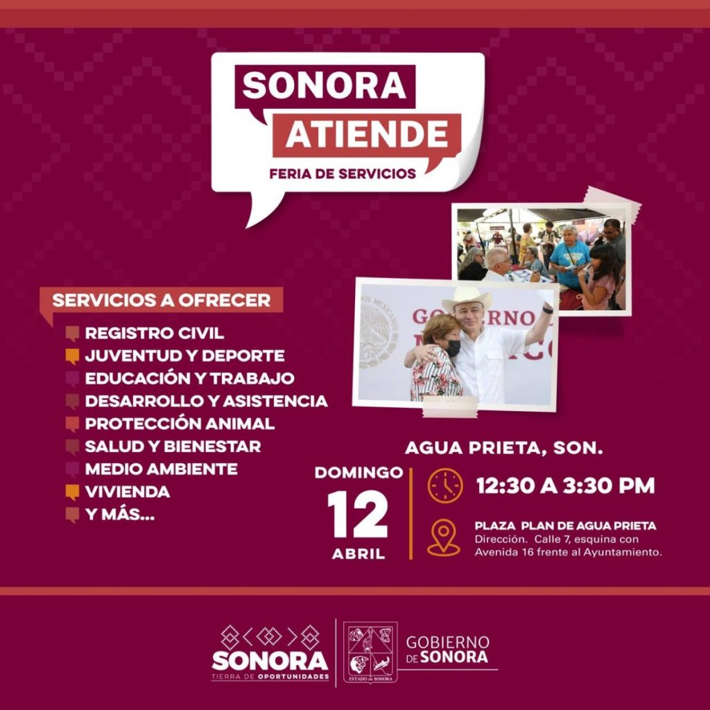 Hermosillo, Sonora; 11 de abril de 2026.- El Gobierno de Sonora, a través de la Secretaría de Salud Pública (SSP), invita a la ciudadanía a aprovechar los servicios gratuitos de salud que se ofrecerán durante la feria “Sonora Atiende”, que se llevará a cabo en Agua Prieta este domingo 12 de abril, en un horario de 12:30 a 15:30 horas, en la Plaza Plan de Agua Prieta.