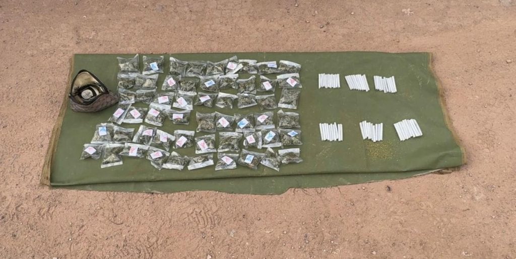 En Agua Prieta, durante recorridos de prevención y vigilancia realizados en coordinación con la Secretaría de la Defensa Nacional (Defensa) y Guardia Nacional, en la colonia Buenos Aires fueron asegurados 56 envoltorios de plástico y 60 cigarrillos que contenían hierba verde y seca con características similares a un narcótico.