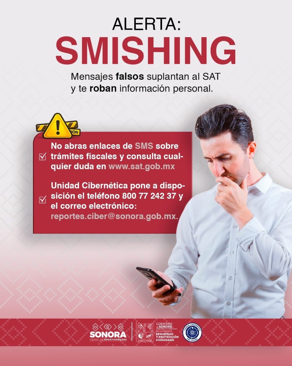 Hermosillo, Sonora; 14 de abril de 2026.- La Secretaría de Seguridad y Protección Ciudadana (SSPC), a través de la Unidad Cibernética, alerta a la ciudadanía sobre mensajes de texto (SMS) falsos que suplantan al Servicio de Administración Tributaria (SAT) con el fin de obtener información personal y bancaria, conocido como “smishing”.